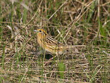 LeConte's sparrow prefers moist open grassy areas with sufficient vegetation cover to provide shelter. Known habitat use includes meadows, fields, crop stubble, shallow marshy edges, prairie, and occasionally fens and lake-shores within the boreal forest.[7] Studies have shown that vegetation seems to have a greater impact on the abundance of this bird than other factors like climate or patch size.[8] Winter et al. (2005) says that it can be found at highest densities in areas with a "moderate amounts of bare ground". Agriculture and drainage of these areas is currently the greatest threat to the LeConte's sparrow.[9]
