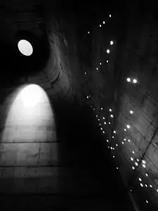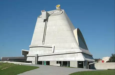 Le Corbusier used raw concrete to construct the convent, which is placed on the side of a hill. The three blocks of dormitories U, closed by the chapel, with a courtyard in the center. The Convent has a flat roof, and is placed on sculpted concrete pillars. Each of the residential cells has small loggia with a concrete sunscreen looking out at the countryside. The centerpiece of the convent is the chapel, a plain box of concrete, which he called his "Box of miracles." Unlike the highly finished façade of the Unité d'Habitation, the façade of the chapel is raw, unfinished concrete. He described the building in a letter to Albert Camus in 1957: "I'm taken with the idea of a "box of miracles"....as the name indicates, it is a rectangual box made of concrete. It doesn't have any of the traditional theatrical tricks, but the possibility, as its name suggests, to make miracles."[63] The interior of the chapel is extremely simple, only benches in a plain, unfinished concrete box, with light coming through a single square in the roof and six small band on the sides. The Crypt beneath has intense blue, red and yellow walls, and illumination by sunlight channeled from above. The monastery has other unusual features, including floor to ceiling panels of glass in the meeting rooms, window panels that fragmented the view into pieces, and a system of concrete and metal tubes like gun barrels which aimed sunlight through colored prisms and projected it onto the walls of sacristy and to the secondary altars of the crypt on the level below. These were whimsically termed the ""machine guns" of the sacristy and the "light cannons" of the crypt.[64]