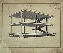 "Reinforced concrete provided me with incredible resources," he wrote later, "and variety, and a passionate plasticity in which by themselves my structures will be rhythm of a palace, and a Pompieen tranquility."[22] This led him to his plan for the Dom-Ino House (1914–15). This model proposed an open floor plan consisting of three concrete slabs supported by six thin reinforced concrete columns, with a stairway providing access to each level on one side of the floor plan.[23] The system was originally designed to provide large numbers of temporary residences after World War I, producing only slabs, columns and stairways, and residents could build exterior walls with the materials around the site. He described it in his patent application as "a juxtiposable system of construction according to an infinite number of combinations of plans. This would permit, he wrote, "the construction of the dividing walls at any point on the façade or the interior."