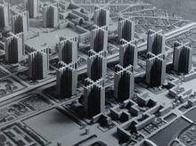 As the global Great Depression enveloped Europe, Le Corbusier devoted more and more time to his ideas for urban design and planned cities. He believed that his new, modern architectural forms would provide an organizational solution that would raise the quality of life for the working classes. In 1922 he had presented his model of the Ville Contemporaine, a city of three million inhabitants, at the Salon d'Automne in Paris. His plan featured tall office towers with surrounded by lower residential blocks in a park setting. He reported that "analysis leads to such dimensions, to such a new scale, and to such the creation of an urban organism so different from those that exist, that it that the mind can hardly imagine it."[49] The Ville Contemporaine, presenting an imaginary city in an imaginary location, did not attract the attention that Le Corbusier wanted. For his next proposal, the Plan Voisin (1925), he took a much more provocative approach; he proposed to demolish a large part of central Paris and to replace it with a group of sixty-story cruciform office towers surrounded by parkland. This idea shocked most viewers, as it was certainly intended to do. The plan included a multi-level transportation hub that included depots for buses and trains, as well as highway intersections, and an airport. Le Corbusier had the fanciful notion that commercial airliners would land between the huge skyscrapers. He segregated pedestrian circulation paths from the roadways and created an elaborate road network. Groups of lower-rise zigzag apartment blocks, set back from the street, were interspersed among the office towers. Le Corbusier wrote: "The center of Paris, currently threatened with death, threatened by exodus, is in reality a diamond mine...To abandon the center of Paris to its fate is to desert in face of the enemy." [50]