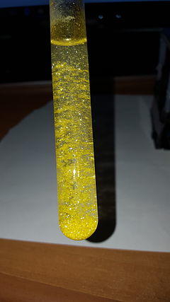 salts usually consists of many small hexagonal platelets, giving the yellow precipitate a silky appearance. Larger crystals can be obtained by exploiting the fact that solubility of lead iodide in water (like those of lead chloride and lead bromide) increases dramatically with temperature. The compound is colorless when dissolved in hot water, but crystallizes on cooling as thin but visibly larger bright yellow flakes, that settle slowly through the liquid — a visual effect often described as "golden rain".[13] Larger crystals can be obtained by autoclaving the PbI
