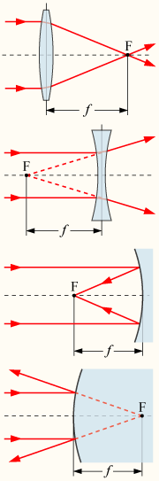 The power of a lens or curved mirror in Dioptres is calculated by the relationship D=1/F, where D is the power in Dioptres and F is the focal length of the device in metres. A convex lens and a concave mirror have positive focal lengths, and hence their strength in Dioptres is also positive. If the lens is concave or the mirror is convex, the focal length, and hence the power in Dioptres, is negative.