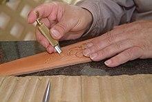 Leather carving is the process of giving a three-dimensional appearance to leather craft objects or works of art by cutting and stamping the surface.