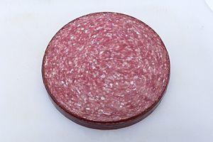 Lebanon bologna is a type of cured, smoked and fermented semidry sausage. Made of beef, it is similar in appearance and texture to salami, though somewhat darker in color. Typically served as a cold cut or appetizer, Lebanon bologna has a distinct tangy flavor, more so than other generally similar fermented meat products such as summer sausage. Hardwood smoking imparts a strong smokiness to the traditionally prepared versions of the product; increasingly, liquid smoke is used as a substitute for this costly time- and labor-intensive process.