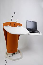 The antique is basically a lectern fitted with the conveniences needed to make writing easy, such as room for paper and writing implements. In a sense, it is a specialised and rarer form of standing desk. The term is sometimes used for large standing desks.