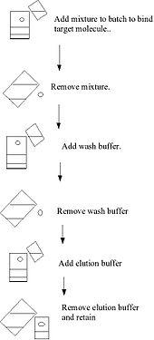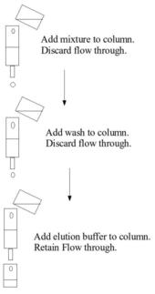 Binding to the solid phase may be achieved by column chromatography whereby the solid medium is packed onto a column, the initial mixture run through the column to allow settling, a wash buffer run through the column and the elution buffer subsequently applied to the column and collected. These steps are usually done at ambient pressure. Alternatively, binding may be achieved using a batch treatment, for example, by adding the initial mixture to the solid phase in a vessel, mixing, separating the solid phase, removing the liquid phase, washing, re-centrifuging, adding the elution buffer, re-centrifuging and removing the elute.
