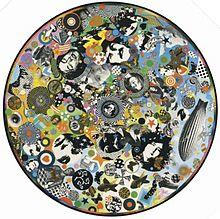 The cover and interior gatefold art consisted of a surreal collection of seemingly random images on a white background, many of them connected thematically with flight or aviation. Behind the front cover was a rotatable laminated card disc, or volvelle, covered with more images, including photos of the band members, which showed through holes in the cover; moving an image into place behind one hole would usually bring one or two others into place behind other holes.[31] The back cover was a composite shot of the best photographs from the photography sessions. Zacron chose the images because he wanted to "show them as the giant force they were in music".[31] In France, this album was released with a different album cover, simply showing a photo of the four band members.[32]