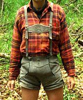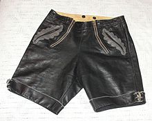 Lederhosen (/ˈleɪdərˌhoʊzən/; German pronunciation: [ˈleːdɐˌhoːzn̩], lit. 'leather breeches'; singular in German usage: Lederhose) are short or knee-length leather breeches that are worn as traditional garments in some regions of German-speaking countries. The longer ones are generally called Bundhosen or Kniebundhosen.[1] Once common workwear across Central Europe, these clothes—or Tracht—are particularly associated with Bavaria and the Tyrol region.