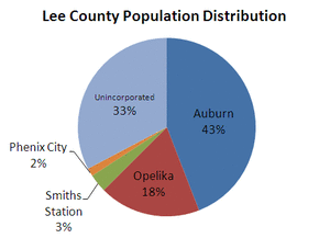 Lee County is a county located in east central Alabama. As of the 2010 census the population was 140,247.[1] The county seat is Opelika,[2] and the largest city is Auburn. The county is named for General Robert E. Lee (1807–1870), who served as General in Chief of the Armies of the Confederate States in 1865.[3] Lee County comprises the Auburn-Opelika, AL Metropolitan Statistical Area, which is included in the Columbus-Auburn-Opelika, GA-AL Combined Statistical Area.