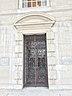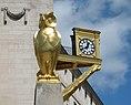 Exterior decoration is minimal but finely-crafted. The three entrance doors inside the portico each have a pair of ornate wrought-iron gates by J. Wippell, London.[17] There is a golden owl on top of each tower by John Hodge, who also carved the coat of arms in the pediment.[15] Each is cast in bronze, covered in gold leaf, is 7 feet 6 inches (2.29 m) tall and weighs half a ton.[9][18] The owl comes from the city seal, itself from the coat of arms of the first Alderman, Sir John Savile.[2] A further 4 owls by City Architect John Thorp were erected on square columns in 2000 as part of the creation of Millennium Square.[19] There are also carved and gilded clocks by Potts & Sons projecting on a bracket from each side of the hall;[3] these have tortoises around the dial.[9] "These were not part of the original brief; they were added by the craftsmen. The workers assured the decision makers that any civic, south facing clocks should include a turtle reference, however small. They asserted that it was a tradition which linked back to ancient Greece where turtles were often used to symbolise and, for a short period, measure time. The truth was more prosaic. Tortoise was the nickname of their apprentice, who not only worked slowly but had no neck."[20]