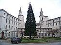 The Civic Hall is on a triangular site at the top of a slope, looking down over what is now Millennium Square, but what was originally an ornamental garden and fountain. It has a symmetrical front, but is in the form of a truncated V[3] where the west wing is longer than the east one.[15] The building abandons the traditional materials of Yorkshire stone or brick to use Portland stone, which important buildings constructed in Leeds between the wars had all used - the Queens Hotel or the University, for example.[16] It has a Cumbrian or Lakeland green slate roof in Palladian style.[3][15] The main portico covers two storeys with a pediment supported on six large Corinthian columns.[9][15] In the centre of the pediment is carved the arms of the city, and in gilded Roman numerals, the dates of the granting of the charter and the completion of the building (1626 and 1933 respectively). The two wings have five storeys.[3] There are two 170 feet (52 m) tall[9][10] towers in the style of Christopher Wren[3][2][15] and similar to the spire of the church of St Vedast by Nicholas Hawksmoor. Harris's first design proposed shorter, domed towers. A partially enclosed courtyard at the north side is the site of a single fir tree and the Councillors' private entrance. It is the only part of the site to use a local material, being paved with Yorkstone setts.[15]