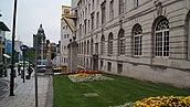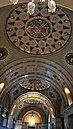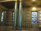 In contrast with the plain exterior, the grand and decorous interior uses much more colour. The marble-lined halls and official rooms are in the building's central part stretching between the towers while council departmental office spaces and committee rooms occupy the wings. Bespoke Wilton carpets cover the floors throughout.[21] The 90 feet (27 m) entrance hall is lined with grey gritstone and green scagliola columns.[15][9] The main staircase has stained glass windows by George Kruger Gray[15] and at the top a bust of King George V by Sir William Reid Dick.[9] This leads to a 90 feet (27 m) long reception hall with three saucer domed ceilings, also by Gray. The three surviving 19th century chandeliers from the Lord Mayor's Rooms at the Town Hall are used to light this space.[15] The Assembly Hall was 100 feet (30 m) long and oak panelled is across the front of the building, now divided to a banqueting hall and other chambers. There is a parlour for the Lord Mayor at the East end[22] and one for the Lady Mayoress at the West end.[23]