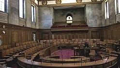 The Council Chamber is sunk in three tiers below entrance level, with an elliptical seating arrangement and public galleries at either end of the chamber. To the height of the doors it is panelled in English walnut, and acoustic tiles of artificial stone above.[15] One of the most original features of the building hangs above the Council Chamber: a huge elliptical candelabrum hung by 8 rods and containing 99 electric bulbs.[1]