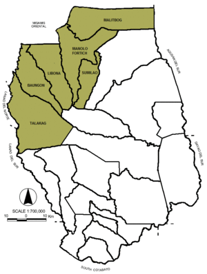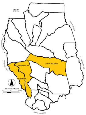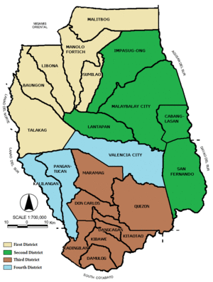 - Municipalities: Baungon, Kalilangan, Libona, Malitbog, Manolo Fortich, Pangantucan, Sumilao, Talakag