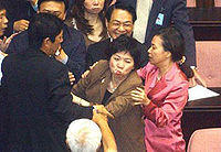 A brawl broke out in the National Diet on 17 September after the House of Councillors approved legislation for the controversial security bills that would allow the country to send troops to fight abroad for the first time since World War II. Members of the opposition tried to grab the microphone and stop Masahisa Sato, acting chairman of the upper house special committee, from carrying out the vote in parliament.[57]