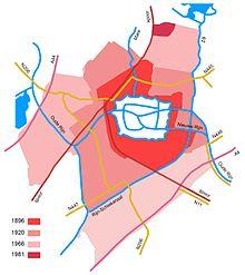 Leiden began to expand beyond its 17th-century moats around 1896 and the number of citizens surpassed 50,000 in 1900. After 1920, new industries were established in the city, such as the canning and metal industries. During World War II, Leiden was hit hard by Allied bombardments. The areas surrounding the railway station and Marewijk were almost completely destroyed.