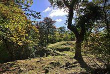 Within Leigh Woods is Stokeleigh Camp, a hill fort thought to have been occupied from the third century BC to the first century AD and also in the Middle Ages.[3] It is situated on a promontory,[4] bounding the north flank of the Nightingale Valley and occupying around 7.5 acres (3.0 ha).[5] Stokeleigh Camp is thought to have been occupied from the late pre-Roman Iron Age, when it was in the area controlled by the Dobunni.[6] Archaeological investigations suggest during the 1st century Belgae tribes may have been present with some of the pottery showing the influence of the Durotriges. There may have been a break in occupation before reuse in the middle to late 2nd century.[5] In addition to the pottery recovered a possible coin of Gallienus dating from his reign between 253 and 268 has been recovered. An iron-involuted brooch of the La Tène II type has also been found.[5] It is unclear whether the occupation of Stokeleigh Camp in the 3rd century was for a formal garrison or whether it was just used by "squatters" or as a place of refuge in times of crisis. Stokeleigh might have been connected with the Wansdyke, a series of defensive linear earthworks, consisting of a ditch and an embankment running at least from Maes Knoll in Somerset, to the Savernake Forest near Marlborough in Wiltshire, however there is little evidence for this. It is also possible that the site was occupied in the Middle Ages.[7]