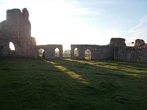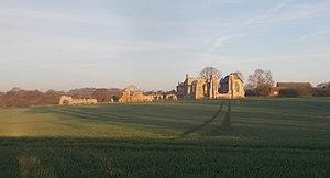 Ranulf de Glanville, who was born at Stratford St Andrew, married Bertha, daughter of Theobald de Valoines, Lord of Parham.[9] In 1171 he founded the Priory of Augustinian canons at Butley, a few miles south of Leiston, on lands settled upon his wife by her father as a marriage endowment.[10] The Premonstratensian house of Leiston ("Leystone") Abbey was planned less than a decade later, and a received date for its foundation was 1183.[11] Close ties existed between the two houses, and with the Augustinian nuns at Campsey Priory, a de Valoines foundation established shortly before 1195.