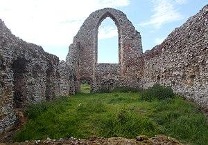 The site of the Leiston old abbey is identified with that of a ruined chapel at Minsmere, which stands near the sea on a marsh-girt island approached by a causeway from Eastbridge.[12] This belief, long uncertain, gained support from aerial photography which appeared to show cropmarks suggesting an extensive complex there.[13] It has since been shown that the chapel was not part of the original abbey, but was constructed on the site of the original monastery church soon after its removal in 1363.[14][15] The suggestion was made by Alfred Suckling in 1848 that Ranulf may have chosen a site which had been used for religious purposes in Anglo-Saxon times.[16]