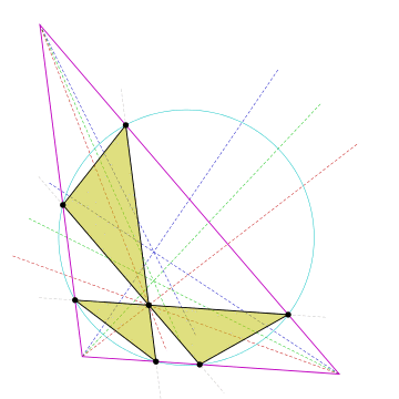 For the simple hexagon drawn in a triangle with side lengths and area the perimeter is given by
