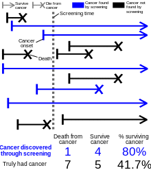As a result, if the same number of slow-growing and fast-growing tumors appear in a year, the screening test detects more slow-growers than fast-growers. If the slow growing tumors are less likely to be fatal than the fast growers, the people whose cancer is detected by screening do better, on average, than the people whose tumors are detected from symptoms (or at autopsy) even if there is no real benefit to catching the cancer earlier. That can give the impression that detecting cancers by screening causes cancers to be less dangerous even if less dangerous cancers are simply more likely to be detected by screening.[1]