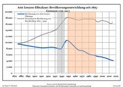 Development of population since 1875 within the current Boundaries (Blue Line: Population; Dotted Line: Comparison to Population development in Brandenburg state; Grey Background: Time of Nazi Germany; Red Background: Time of communist East Germany)