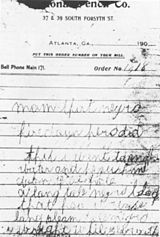 [H]e asked me could I write and I told him yes I could write a little bit, and he gave me a scratch pad and ... told me to put on there "dear mother, a long, tall, black negro did this by himself," and he told me to write it two or three times on there. I wrote it on a white scratch pad, single ruled. He went to his desk and pulled out another scratch pad, a brownish looking scratch pad, and looked at my writing and wrote on that himself.[36]