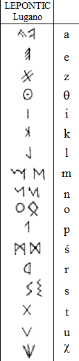 The alphabet of Lugano, based on inscriptions found in northern Italy and Canton Ticino, was used to record Lepontic inscriptions, among the oldest testimonies of any Celtic language, in use from the 7th to the 5th centuries BC. The alphabet has 18 letters, derived from the archaic Etruscan alphabet