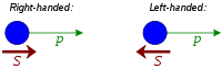 A closely related property is chirality, which in turn is closely related to a more easily visualized property called helicity. The helicity of a particle is the direction of its spin relative to its momentum; particles with spin in the same direction as their momentum are called right-handed and they are otherwise called left-handed. When a particle is massless, the direction of its momentum relative to its spin is the same in every reference frame, whereas for massive particles it is possible to 'overtake' the particle by choosing a faster-moving reference frame; in the faster frame, the helicity is reversed. Chirality is a technical property, defined through transformation behaviour under the Poincaré group, that does not change with reference frame. It is contrived to agree with helicity for massless particles, and is still well defined for particles with mass.