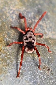 Leptus is a genus of large mites belonging to the family Erythraeidae; they resemble members of the related genus Balaustium, but can be distinguished by the eyes, which in Leptus species are set much further forward on the body than in Balaustium species.