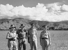On 7 November 1943, Morshead became acting commander of New Guinea Force and Second Army on Mackay's departure to become the Australian High Commissioner to India. This became permanent on 20 January 1944.[73] Major General Frank Berryman became commander of II Corps. Because of some sensitivities concerning the relative seniority of Berryman and Major General George Alan Vasey, Blamey placed Vasey's 7th Division directly under Morshead's command.[74] Vasey soon chafed under Morshead's command, feeling that "he has too many favourites both individually and collectively",[75] with men who had served at El Alamein receiving preferential treatment.[75] Morshead was in overall charge of the forces in New Guinea in the battles of Sattelberg, Jivevaneng, Sio and Shaggy Ridge. His perseverance was rewarded with the capture of Madang in April 1944.[73]