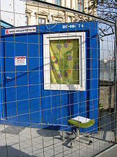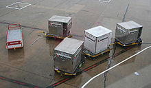 In April 1951, at Zürich Tiefenbrunnen railway station, the Swiss Museum of Transport and Bureau International des Containers (BIC) held demonstrations of container systems, with the aim of selecting the best solution for Western Europe. Present were representatives from France, Belgium, the Netherlands, Germany, Switzerland, Sweden, Great Britain, Italy and the United States. The system chosen for Western Europe was based on the Netherlands' system for consumer goods and waste transportation called Laadkisten (literally, "loading bins"), in use since 1934. This system used roller containers that were moved by rail, truck and ship, in various configurations up to a capacity of 5,500 kg (12,100 lb), and up to 3.1 by 2.3 by 2 metres (10 ft 2 in × 7 ft 6 1&fras1;2 in × 6 ft 6 3&fras1;4 in) size.[14][15] This became the first post World War II European railway standard UIC 590, known as "pa-Behälter." It was implemented in the Netherlands, Belgium, Luxembourg, West Germany, Switzerland, Sweden and Denmark.[16] With the popularization of the larger ISO containers, support for pa containers was phased out by the railways. In the 1970s they began to be widely used for transporting waste.[16]