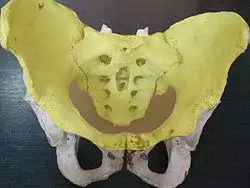 The lesser pelvis (or "true pelvis") is the space enclosed by the pelvic girdle and below the pelvic brim: between the pelvic inlet and the pelvic floor. This cavity is a short, curved canal, deeper on its posterior than on its anterior wall.[1] Some consider this region to be the entirety of the pelvic cavity. Others define the pelvic cavity as the larger space including the greater pelvis, just above the pelvic inlet.