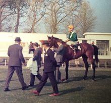 Piggott began racing horses from his father's stable when he was 10 years old and won his first race in 1948, aged 12 years, on a horse called The Chase at Haydock Park.[9] Piggott is known for his quiet demeanour. He describes his mother as wisely playing down his success, while his father rarely gave advice unless there had been a particular mistake. By his teens a sensation in the racing world, he rode his first winner of The Derby on Never Say Die in 1954 aged 18 years and went on to win eight more, on Crepello (1957), St. Paddy (1960), Sir Ivor (1968), Nijinsky (1970), Roberto (1972), Empery (1976), The Minstrel (1977) and Teenoso (1983). He was stable jockey to Noel Murless and later to Vincent O'Brien and had a glittering career of unparalleled success. Known as the "housewives' favourite", Piggott had legions of followers and did much to expand the popularity of horse racing beyond its narrow, class-based origins.