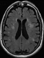 White matter hyperintensities can be caused by a variety of factors, including ischemia, micro-hemorrhages, gliosis, damage to small blood vessel walls, breaches of the barrier between the cerebrospinal fluid and the brain, or loss and deformation of the myelin sheath.[8] Multiple small vessel infarcts in the subcortical white matter can cause the condition, often the result of chronic hypertension leading to lipohyalinosis of the small vessels. Patients may develop subcortical dementia syndrome.[9]