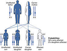 Leukodystrophy is most often an inherited disease that is usually the result of an autosomal recessive inheritance pattern, although dominant inheritance patterns are not unheard of, as in the case of adult-onset leukodystrophy.[13] This means that the affected allele is carried on an autosomal, or non-sex, chromosome and is masked by the dominant, unaffected phenotype. In other words, for an individual to inherit the leukodystrophy phenotype, he or she must carry two of the recessive, mutant alleles. Krabbe disease and metachromatic leukodystrophy (MLD) are two of such type. MLD is found on human chromosome 22 at position q13.31.[14] Another type of inherited leukodystrophy is X-linked adrenoleukodystrophy (X-ALD). As its name implies, this type of leukodystrophy is the result of a mutation found on the X-chromosome. It is also carried in a recessive pattern. The X chromosome is a sex chromosome, and since women have two “chances” of acquiring a normal X chromosome (one maternal, one paternal), and males only one (one maternal), this disease is more likely to be seen in men than in women. The mutation resulting in adult-onset leukodystrophy is mapped at 5q23.[13]