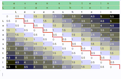 In information theory, linguistics, and computer science, the Levenshtein distance is a string metric for measuring the difference between two sequences. Informally, the Levenshtein distance between two words is the minimum number of single-character edits (insertions, deletions or substitutions) required to change one word into the other. It is named after the Soviet mathematician Vladimir Levenshtein, who considered this distance in 1965.[1]