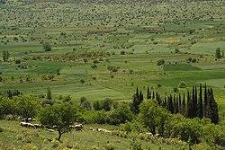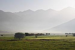 From the town’s center The square overlooks Mainalo, Ascension Hill, Mount Artemisio and Helmos. and the huge plain (Οropedio) below. At the other end of the plain below there are abruptly rising mountain ranges. The plain is a closed geological basin of karstic origin. The Mainalo’s slopes are forested. But the landscape of the plain below is grassy and rural. Hills and mountains frame the plain on all sides, they are covered by rock debris (in geology) and shrubs.