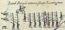 In their accounts afterward, British officers and soldiers alike noted their frustration that the colonial militiamen fired at them from behind trees and stone walls, rather than confronting them in large, linear formations in the style of European warfare.[96] This image of the individual colonial farmer, musket in hand and fighting under his own command, has also been fostered in American myth: "Chasing the red-coats down the lane / Then crossing the fields to emerge again / Under the trees at the turn of the road, / And only pausing to fire and load."[97] To the contrary, beginning at the North Bridge and throughout the British retreat, the colonial militias repeatedly operated as coordinated companies, even when dispersed to take advantage of cover. Reflecting on the British experience that day, Earl Percy understood the significance of the American tactics:
