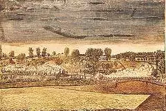Percy took the land route across Boston Neck and over the Great Bridge, which some quick-thinking colonists had stripped of its planking to delay the British.[101] His men then came upon an absent-minded tutor at Harvard College and asked him which road would take them to Lexington. The Harvard man, apparently oblivious to the reality of what was happening around him, showed him the proper road without thinking. (He was later compelled to leave the country for inadvertently supporting the enemy.)[102] Percy's troops arrived in Lexington at about 2:00 p.m. They could hear gunfire in the distance as they set up their cannon and deployed lines of regulars on high ground with commanding views of the town. Colonel Smith's men approached like a fleeing mob with the full complement of colonial militia in close formation pursuing them. Percy ordered his artillery to open fire at extreme range, dispersing the colonial militiamen. Smith's men collapsed with exhaustion once they reached the safety of Percy's lines.[103]
