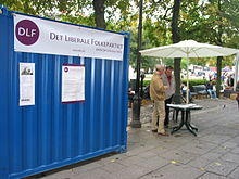 During the 1990s, some of the Progress Party's members considered the party to have become less liberal than it had been in its earlier days. These members of the Progress Party then decided to join the DLF.[1] The DLF then took increasingly more classically liberal viewpoints on most issues, emerging as a promoter of economic liberalism and laissez-faire capitalism. The party's politics states that the state should only protect individuals' rights through police, courts of law and a military service.