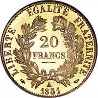 As soon as 6 January 1852, the future Napoleon III, first President of the Republic, ordered all prefects to erase the triptych from all official documents and buildings, conflated with insurrection and disorder.[2] Auguste Comte applauded Napoleon, claiming equality to be the "symbol of metaphysical anarchism", and preferring to it his diptych "ordre et progrès" ("order and progress", which would then become the motto of Brazil, Ordem e Progresso).[13] On the other hand, Proudhon criticized fraternity as an empty word, which he associated with idealistic dreams of Romanticism.[2] He preferred to it the sole term of liberty.
