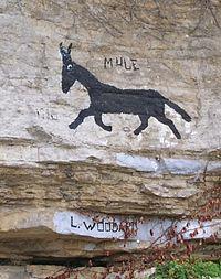 The "Allen Bluff Mule" is a painting of a mule on a limestone bluff on U.S. Route 70 in Liberty. Some residents say a local man named Lavader Woodard painted the mule; other residents contend that it was painted as an advertisement of a local stock farm. Dr. Wayne T. Robinson has claimed to be the original painter of the Liberty Mule:
