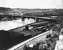 The Liberty Bridge is a steel cantilever bridge and was constructed as the missing link between downtown Pittsburgh and the Liberty Tunnel, which had been constructed four years earlier in 1924 as a link to the South Hills. The bridge opened on March 27, 1928, following a 5-mile (8.0 km) vehicle parade[2] from the southern suburbs of the city, which crossed the Smithfield Street Bridge and proceeded through downtown before ending at the southern end of the new bridge.[3]