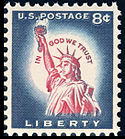 The Liberty issue was a definitive series of postage stamps issued by the United States between 1954 and 1965. It offered twenty-four denominations, ranging from a half-cent issue showing Benjamin Franklin to a five dollar issue depicting Alexander Hamilton. However, in a notable departure from all definitive series since 1870, the stamp for a normal first-class letter—the 3-cent value—did not present the portrait of a president, but instead offered a monocolor image of the Statue of Liberty. Moreover, two-color renderings of the Statue of Liberty (Liberty Enlightening the World) appeared on both the 8 cent and 11 cent stamps; and it is from these three denominations that the Liberty issue takes its name. (Oversized versions of the 3¢ and 8¢ stamps also appeared on a miniature sheet issued in 1956 for the Fifth International Philatelic exhibition.) Pictures of other national landmarks, such as Bunker Hill and Mount Vernon, are found on several values, while the rest of the stamps follow tradition, containing portraits of well-known historic Americans. The six denominations in the set that illustrate buildings (The Alamo, Monticello, etc.) were all designed in landscape format, resulting in a free intermixture of landscape and portrait orientation for the first time in a definitive U.S. issue (in all previous mixed sets, landscape stamps had been confined to the highest denominations).[1]