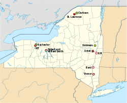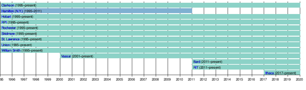 The league includes founding members Clarkson University, Hobart and William Smith Colleges, the University of Rochester, Rensselaer Polytechnic Institute, St. Lawrence University, Skidmore College, and Union College. Vassar College became a full member of the league during the 2000–01 academic year, Bard College and Rochester Institute of Technology joined for the 2011–12 academic year, and Ithaca College officially joined for the 2017–18 academic year. Founding member Hamilton College departed following the 2010–11 academic year in order to fully integrate its athletic programs within the New England Small College Athletic Conference (NESCAC).