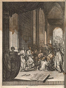 Frontispiece 1720 edition of Institutio Oratoria, showing Quintilian teaching rhetoric- Opera 2 vols. 1527
