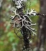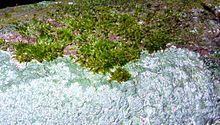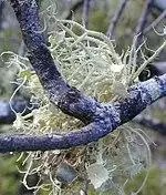 A macrolichen is a lichen that is either bush-like or leafy; all other lichens are termed microlichens.[2] Here, "macro" and "micro" do not refer to size, but to the growth form.[2] Common names for lichens may contain the word moss (e.g., "reindeer moss", "Iceland moss"), and lichens may superficially look like and grow with mosses, but lichens are not related to mosses or any plant.[4]:3 Lichens do not have roots that absorb water and nutrients as plants do,[7]:2 but like plants, they produce their own nutrition by photosynthesis.[8] When they grow on plants, they do not live as parasites, but instead use the plant's surface as a substrate.
