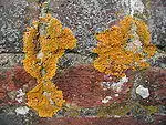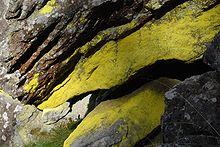 Different colored lichens may inhabit different adjacent sections of a rock face, depending on the angle of exposure to light.[31] Colonies of lichens may be spectacular in appearance, dominating much of the surface of the visual landscape in forests and natural places, such as the vertical "paint" covering the vast rock faces of Yosemite National Park.[32]