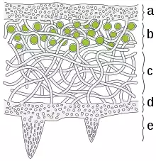 Fruticose, foliose, crustose, and squamulose lichens generally have up to three different types of tissue, differentiated by having different densities of fungal filaments.[34] The top layer, where the lichen contacts the environment, is called a cortex.[34] The cortex is made of densely tightly woven, packed, and glued together (agglutinated) fungal filaments.[34] The dense packing makes the cortex act like a protective "skin", keeping other organisms out, and reducing the intensity of sunlight on the layers below.[34] The cortex layer can be up to several hundred micrometers (μm) in thickness (less than a millimeter).[37] The cortex may be further topped by an epicortex of secretions, not cells, 0.6–1 μm thick in some lichens.[37] This secretion layer may or may not have pores.[37]